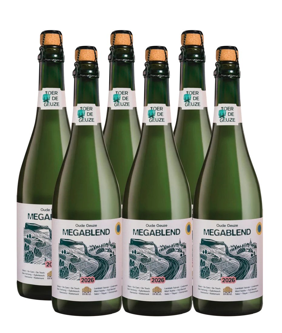 Every two years, the HORAL members bring together their young and old lambics to create a special Oude Geuze in a limited edition on the occasion of the Toer de Geuze: the Megablend. For this Megablend, lambic was used from 14 producers: Boon, De Oude Cam, De Troch, Den Herberg, Eylenbosch, Hanssens, Kestemont, Lambiek Fabriek, Lindemans, Mort Subite, Oud Beersel, Sako, Tilquin and Timmermans.